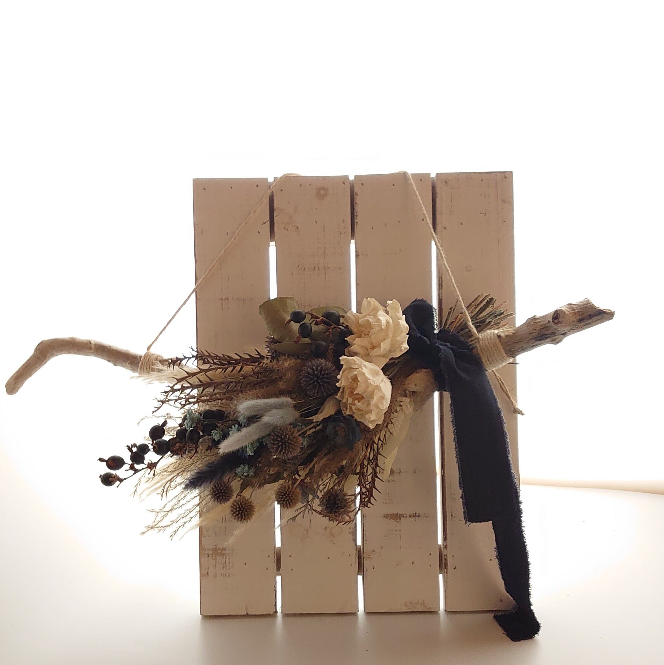 自然素材の花材で個性豊かなスワッグをプレゼント用にラッピングをしてのお届けとなります。