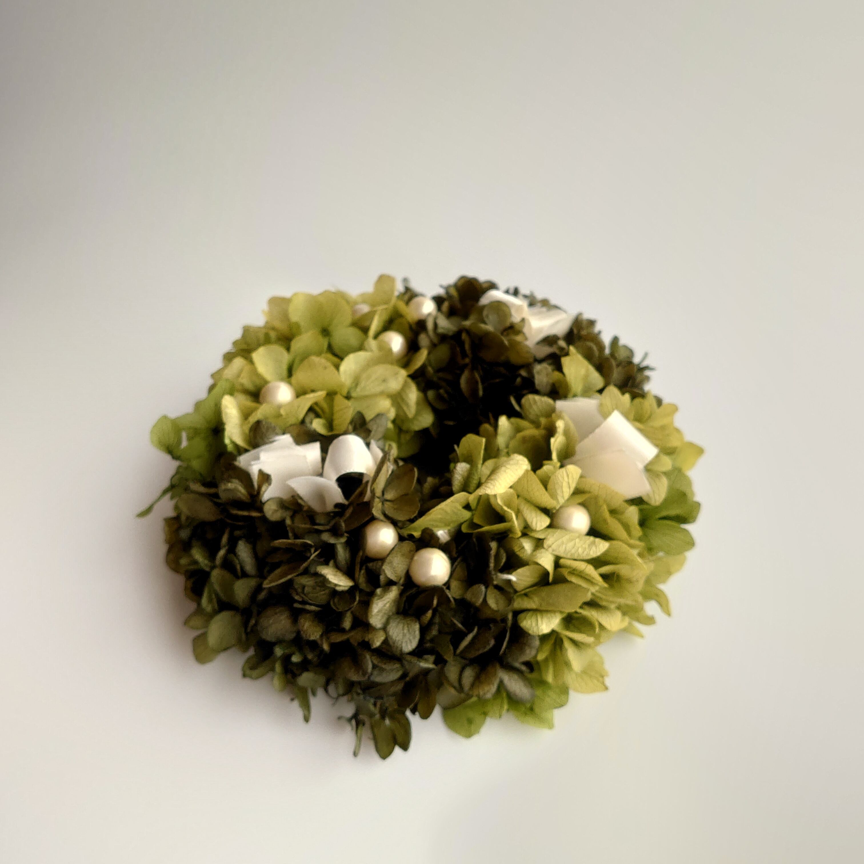落ち着いたグリーンの色合いのグラデーションが上品なイメージですが、アイボリーのリボンとパールで可愛らしさをプラス…存在感のあるリースになっております。