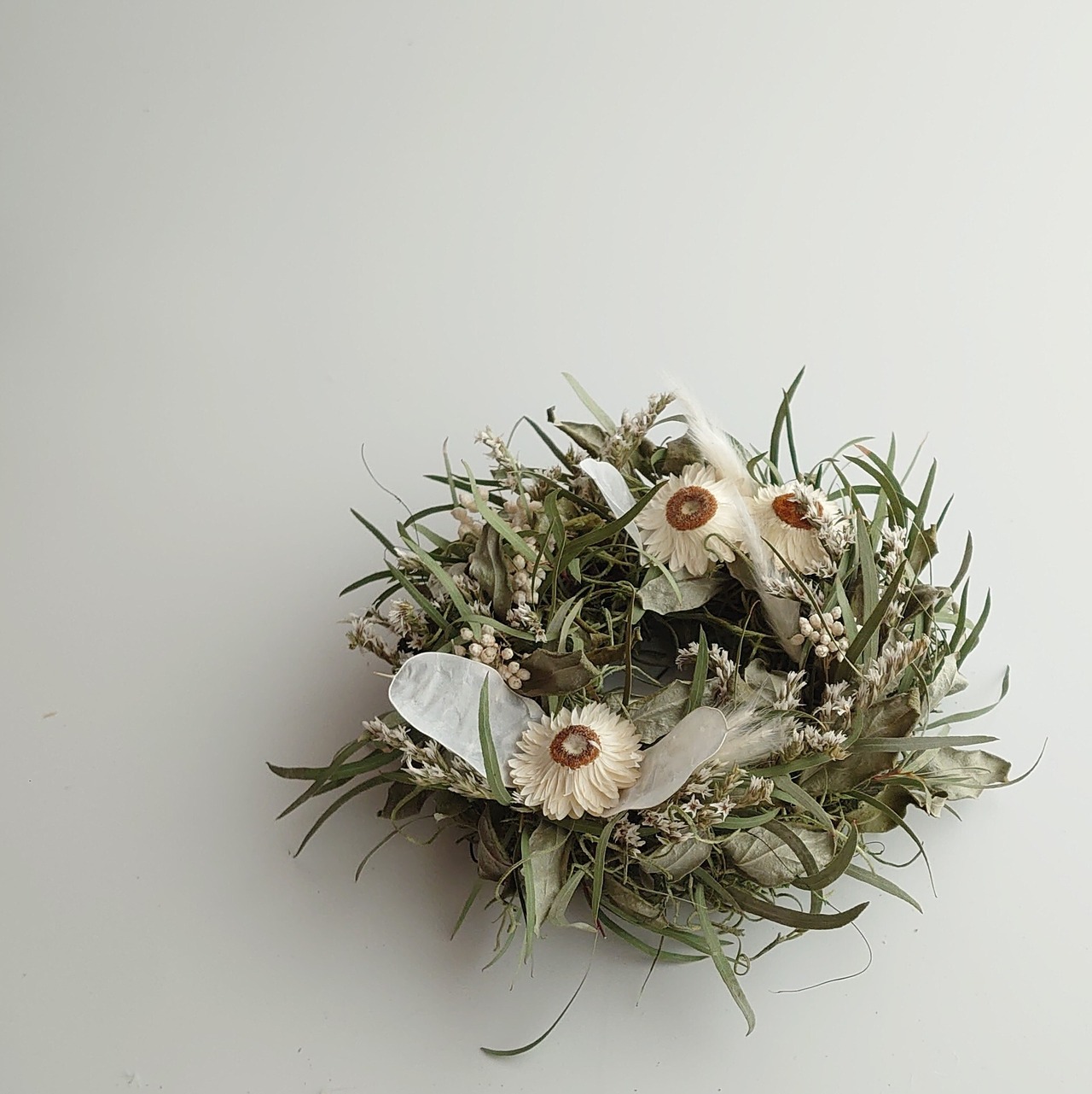 飾り安いミニサイズのリース。ルナリアをアクセントに少し透明感をプラスしました。