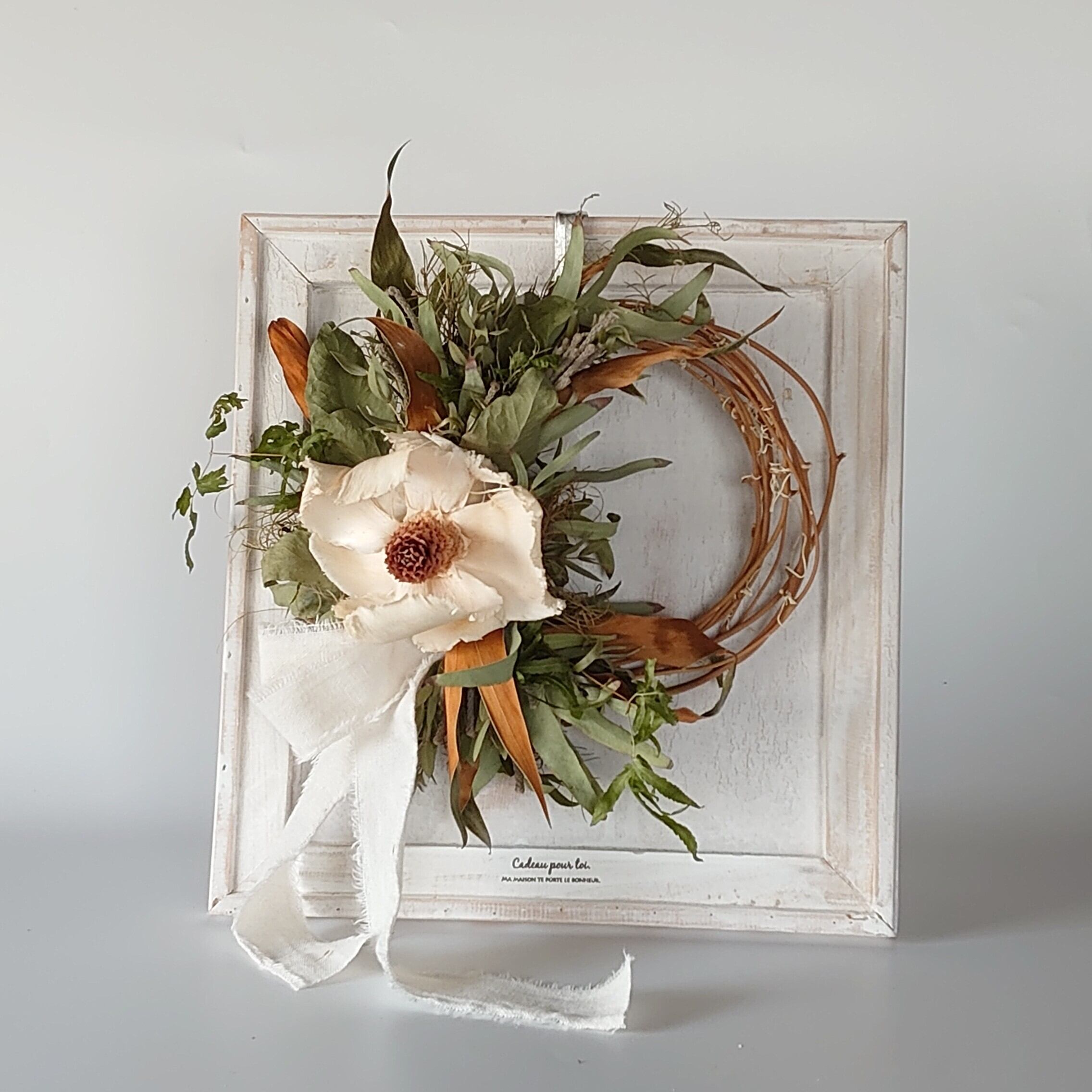 パームフラワーとグリーンのリースは、自然の美しさと植物の力で心と体を癒します。あなたの居場所に自然の香りと温もりを取り入れてみませんか?